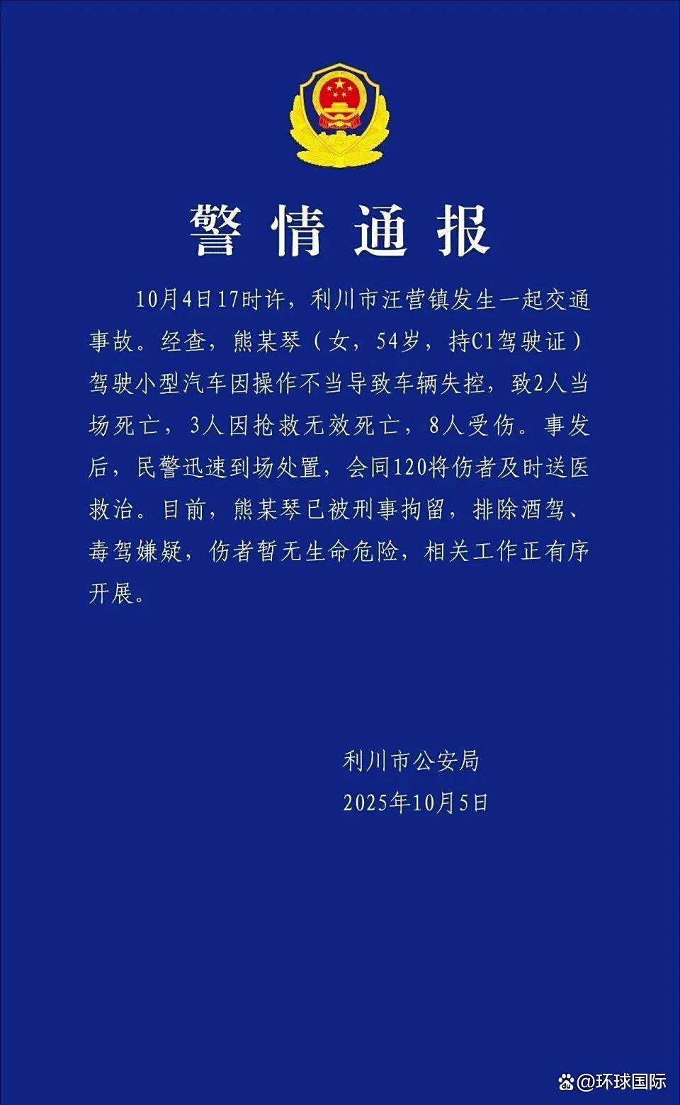 2025Äê10ÔÂ4ÈÕ17ʱÐí£¬ÔÚºþ±±Ê¡Àû´¨ÊÐÍôÓªÕò£¬Ò»Ãû54ËêÅ®×ÓÐÜijÇÙ£¨³ÖC1¼Ýʻ֤£©Òò¼ÝÊ»²Ù×÷²»µ±µ¼Ö³µÁ¾Ê§¿Ø£¬Òý·¢ÖØ´ó½»Í¨Ê¹ʣ¬Ôì³É5ÈËËÀÍö¡¢8ÈËÊÜÉË¡£Ê·¢ºó£¬¾¯·½Ñ¸ËÙ½éÈë´¦Öã¬ÉËÕß±»ËÍÒ½¾ÈÖΣ¬ÐÜijÇÙÒѱ»ÐÌʾÐÁô£¬²¢Åųý¾Æ¼Ý¡¢¶¾¼ÝÏÓÒÉ‌¡£